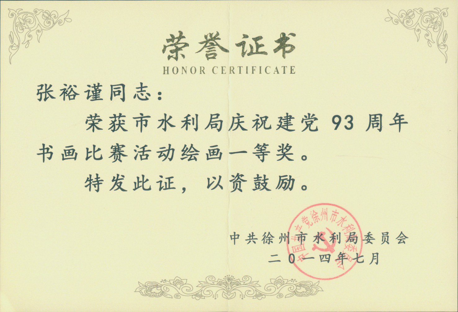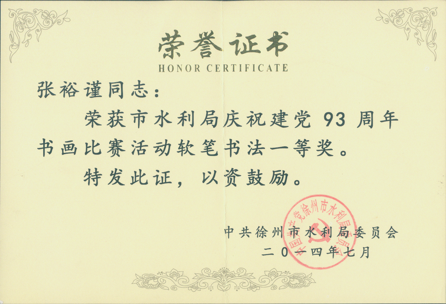近日,市水利局舉辦慶祝建黨93周年書畫比賽活動。本次書畫比賽以“學黨史、知黨情、跟黨走”為宗旨,以“濃墨書華誕,丹青繪七一”為主題,緊密圍繞建黨93周年,緊扣時代主旋律,踐行黨的群眾路線,以書畫形式思黨恩、頌黨情、贊黨績,謳歌黨的豐功偉績,加強了水利局書畫愛好者之間的交流溝通。本次書畫比賽共收到到毛筆書法、硬筆書法、國畫、工筆畫等作品30余幅并進行集中展出,參賽作品主題鮮明,內容豐富,充分反映了水利系統干部職工熱愛黨、熱愛祖國、熱愛社會主義,創先爭優的良好精神風貌。經組委會最終評定,我院職工張裕謹最終獲得軟筆書法、繪畫一等獎。